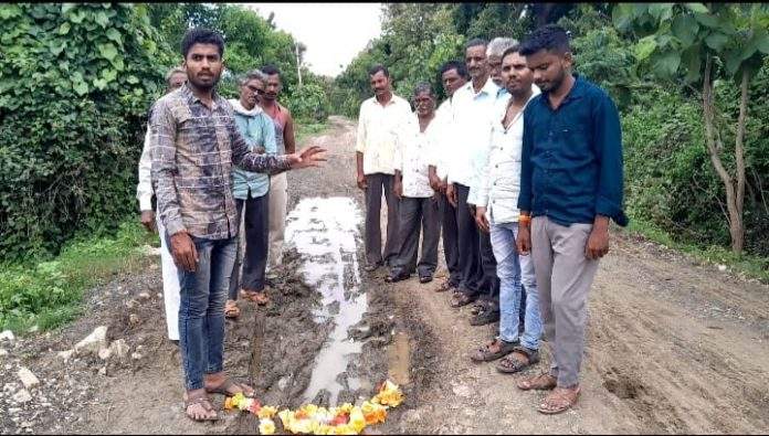 वरोरा:- तालुक्यातील बामर्डा रस्त्याची अत्यंत दयनीय अवस्था झाली आहे. गावाला जोडणारा रस्ता पूर्ण खराब झाला आहे. गावाचे अंतर्गत मुख्य रस्ताला पांढण रस्त्याचे स्वरुप आले आहे. इथे लोक राहतात की जनावर अशी अवस्था आहे. अनेक अपघात घडत आहेत. लोकांचा जीव जावून सुद्धा लोकप्रतिनिधी व बांधकाम विभाग झोपेत आहेत. नागरिकांना जीव मुठीत धरून प्रवास करावा लागतो आहे. साध पायदळ चालणे अवघड झाले आहे. अनेक लोक मोटारसायकल ने पडले आहेत. दररोज अपघात घडत असून या भागातील नागरिकांना संकटाचा सामना करावा लागतो आहे. संतप्त नागरिकांनी या बाबत शिवसेना (उद्धव बाळासाहेब ठाकरे) युवासेना सैनिक अभिजित कुडे याना या बाबत तक्रार केली असता तात्काळ रस्त्याचे काम करावे अन्यथा शिवसेना कार्यपद्धती ने काम करू असा इशारा अभिजित कुडे यांनी दिला. नागरिकांनी रस्त्यातील खड्डाला हार घालून आदरांजली वाहिली व या मुर्दाड प्रशासनाचा निषेध व्यक्त केला सामाजिक कार्यकर्ते वसंत साळवे व अभिजित कुडे यांच्या नेतृत्त्वाखाली आंदोलन करण्यात आले यावेळी वैभव देवतळे, रोशन भोयर, सुरेश ढोके, विकास ढोके,सुरेश साळवे,सुनील साळवे, नीलेश सपाट, तेजस हरबळे,बळीराम ताजने, सुदर्शन आत्राम, दशरथ हरबळे व गावकरी उपस्थित होते.