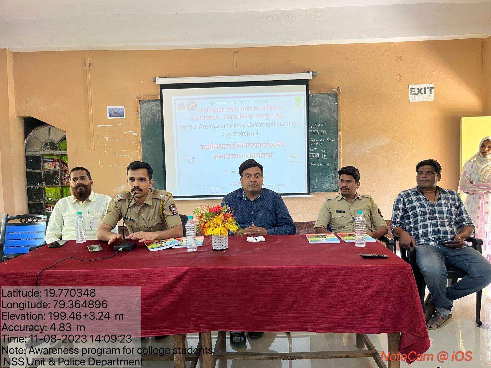 राजुरा:श्री शिवाजी महाविद्यालयातील राष्ट्रीय सेवा योजना पथक व पोलीस स्टेशन राजुराच्या संयुक्त विद्यमाने महाविद्यालयीन विद्यार्थ्यासाठी जागरूकता कार्यक्रम घेण्यात आला. या कार्यक्रमाला मुख्य मार्गदर्शक म्हणून राजुरा येथील उपविभागीय पोलीस अधिकारी विशाल नागरगोजे यांनी विद्यार्थ्यांना मार्गदर्शन केले, सायबर क्राईम, पोक्सो कायदा, विद्यार्थिनीच्या हिताचे कायदे, सोशल मीडियावरील फसवणूक अशा विविध विषयावर विद्यार्थ्यांना मार्गदर्शन केले सोबतच स्पर्धा परीक्षेबद्दल ही माहिती दिली. विद्यार्थ्यांनी सतर्क राहून समाजातील वाईट प्रवृत्तीना आळा घालण्यासाठी पोलिस विभागाला मदत करावी असे आवाहनही केले. या कार्यक्रमाला अध्यक्ष म्हणून महाविद्यालयाचे प्राचार्य डॉ एस. एम. वारकड उपस्थित राहून मार्गदर्शन केले. सोबत कार्यक्रमाला संघपाल गेडाम व दिनेश देवाडे यांची उपस्थिती होती. कार्यक्रमाचे संचालन व आभार राष्ट्रीय सेवा योजना कार्यक्रम अधिकारी प्रा. गुरुदास बल्की यांनी केले.