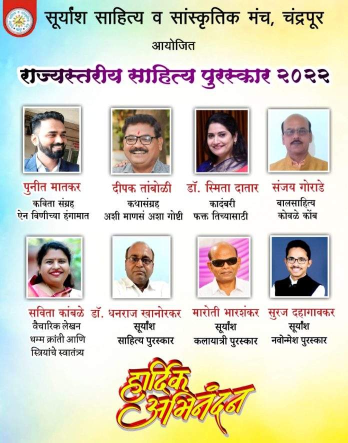 चंद्रपूर : सूर्यांश संस्थेचे राज्यस्तरीय साहित्य पुरस्कार जाहीर