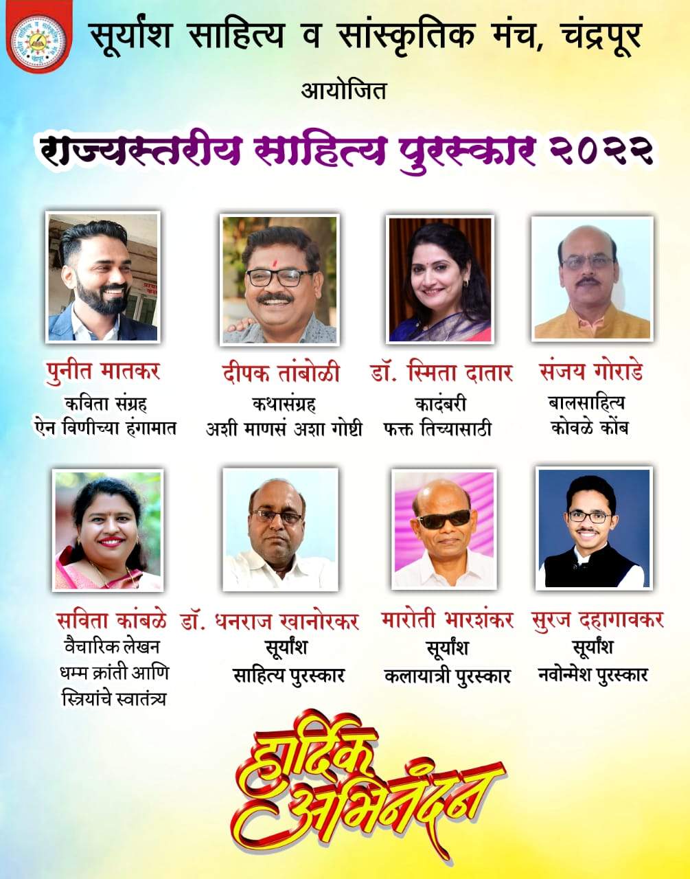 चंद्रपूर : चंद्रपुरातील सूर्यांश साहित्य व सांस्कृतिक मंच चंद्रपूर तर्फे देण्यात येणारे २०२२ चे राज्यस्तरीय साहित्य पुरस्कार निवड समिती प्रमुख माजी नगरसेवक संजय वैद्य आणि संस्थेचे सचिव प्रदीप देशमुख यांनी जाहीर केले.