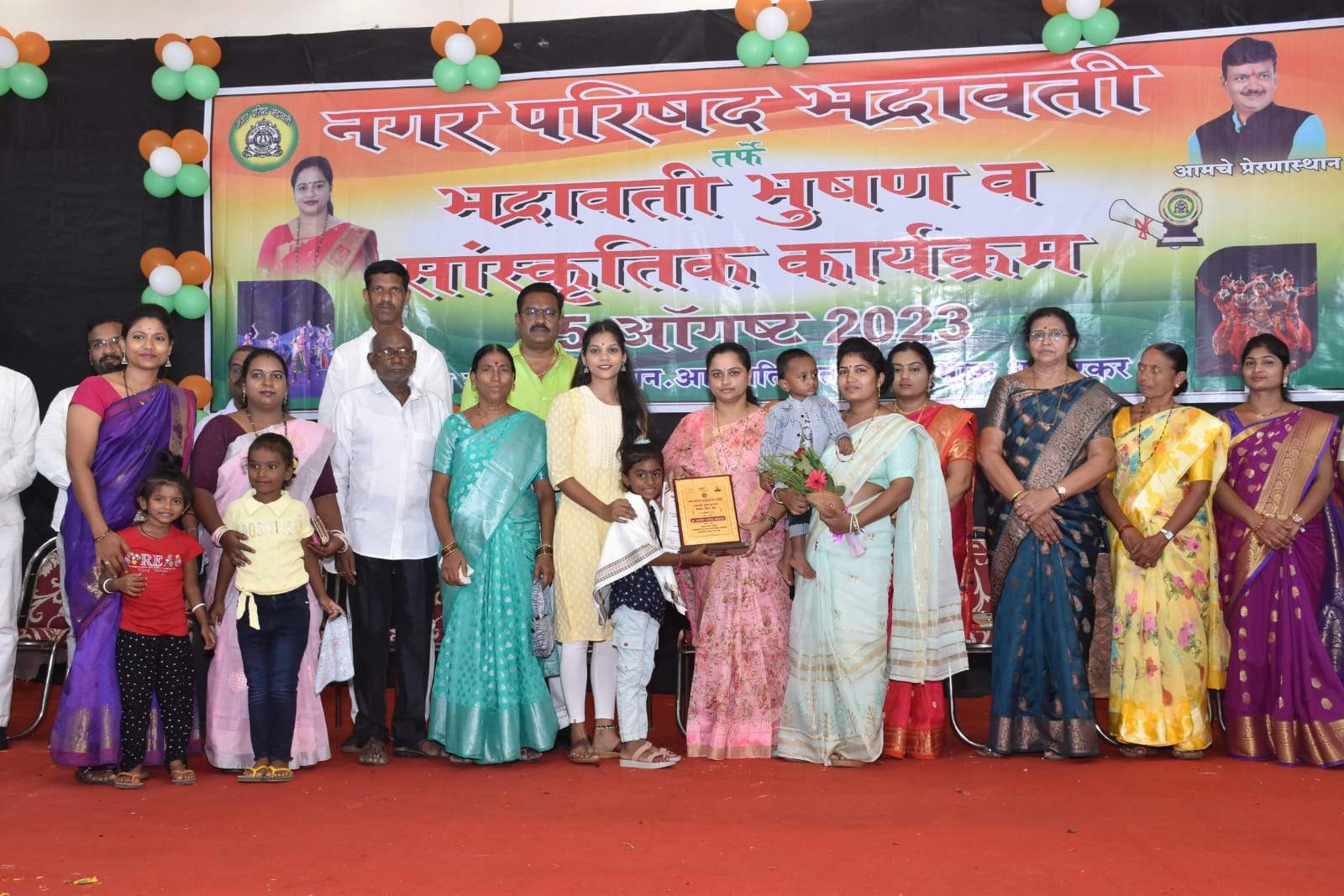 भद्रावती: स्वातंत्र्य दिन १५ ऑगस्ट समारंभ व भद्रावती नगर परिषदेच्या रौप्य महोत्सवी वर्षानिमित्त “भद्रावती भूषण पुरस्कार” व “भव्य सांस्कृतिक कार्यक्रम” असे संयुक्त आयोजन भद्रावती येथील मुरलीधर पाटील गुंडावार सभागृहात करण्यात आले या कार्यक्रमाला भद्रावती-वरोरा विधानसभा मतदारसंघाच्या आमदार श्रीमती प्रतिभाताई धानोरकर ,नगराध्यक्ष अनिल धानोरकर,न.प. उपाध्यक्ष संतोष आमणे ,मुख्याधिकारी विशाखा शेळके, उपमुख्य अधिकारी गायकवाड नगरपरिषदेचे सर्व समित्यांचे सभापती यांचेसह बहुसंख्य नगरसेवकांची मंचावर उपस्थिती होती.