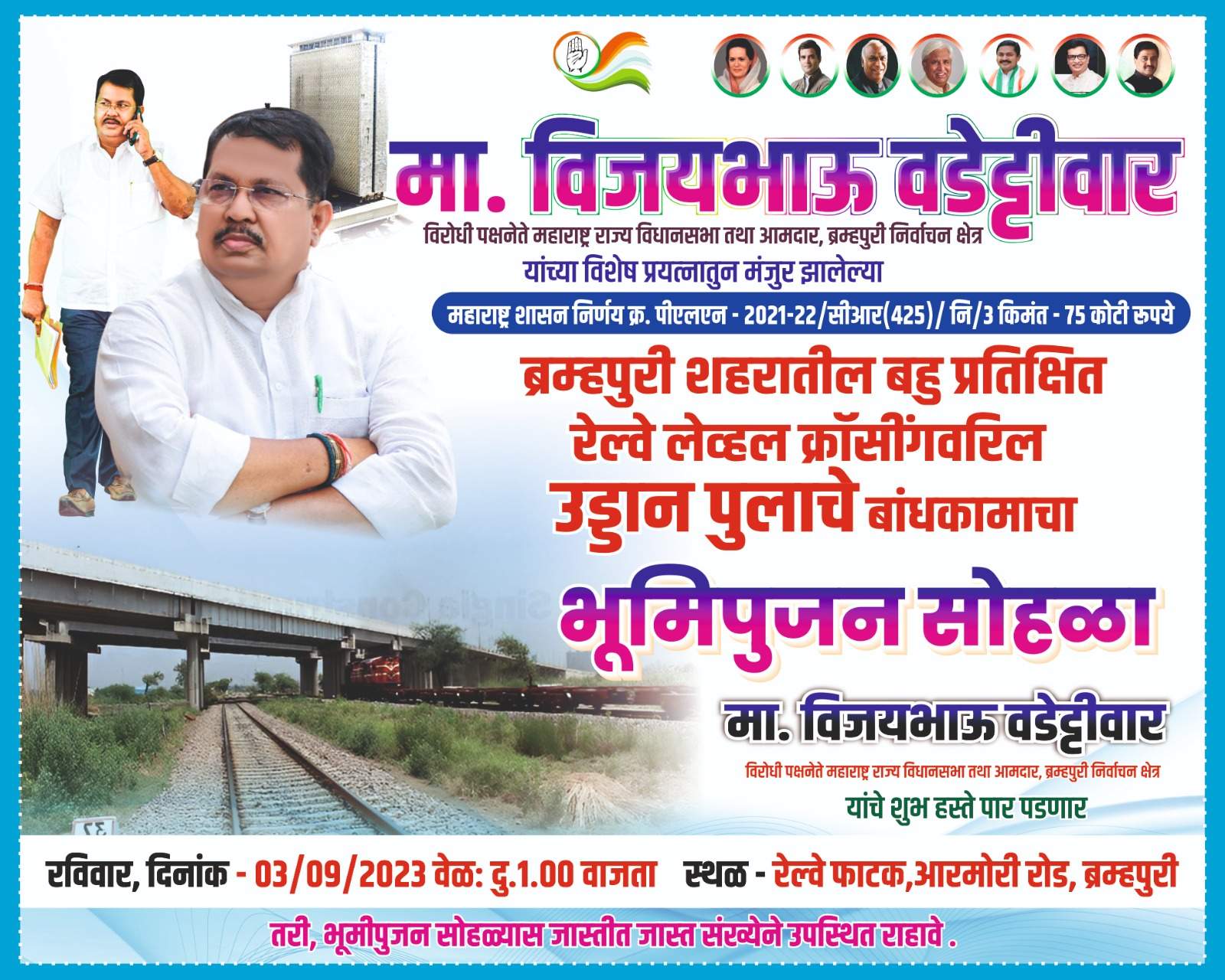 ब्रम्हपूरी: ब्रम्हपूरी-आरमोरी रस्त्यावरील रेल्वे क्राॅसिंगवरील उड्डाणपुलाचे भुमीपुजन राज्याचे विरोधी पक्षनेता, ब्रम्हपुरी विधानसभा क्षेत्राचे आमदार विजय वडेट्टीवार यांच्या हस्ते आज दि. 3 सप्टेंबर रोजी दुपारी 1 वाजता, ब्रम्हपुरी-आरमोरी रस्त्यावरील रेल्वे फाटक च्या बाजुला असलेल्या मैदानात पार पडणार आहे.