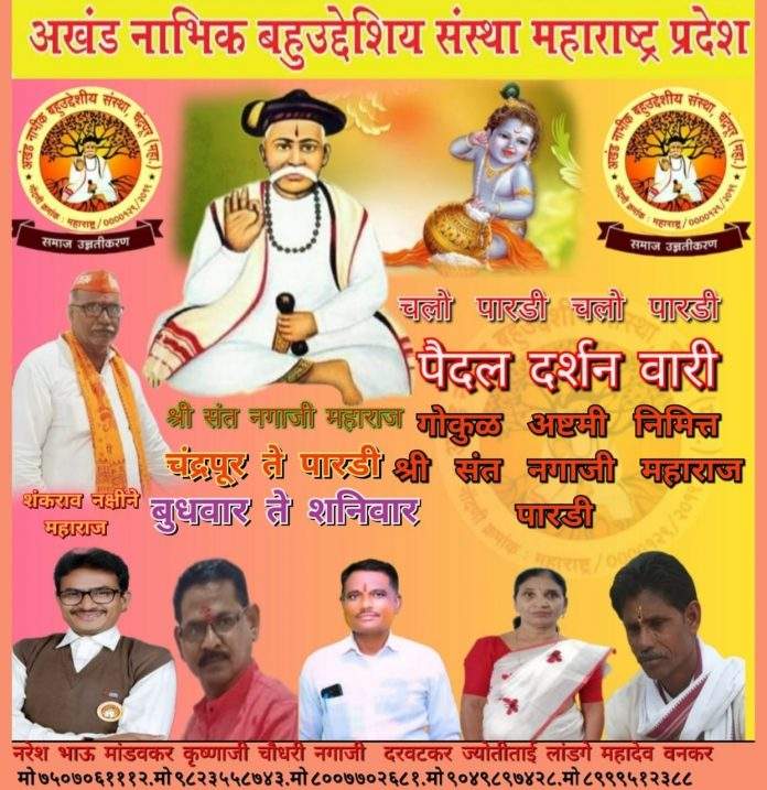 श्रीकृष्ण जन्म अष्टमी असल्यामुळे नगाजी महाराजाचे प्रचार, प्रसारक नरेश मांडवकर,शंकररावजी नक्षीने, महादेवराव वनकर, नगाजी दरवरकर, ज्योतीताई लांडगे यांनी बुधवार पासून ते शनिवार पर्यंत चंद्रपूर ते पारडी असा पायदळ करणार आहे. काही लोकांना अजूनही माहिती नाही की, नगाजी महाराज्यांचे देवस्थान कुठे आहे….? पारडी येथे महाराजाचे प्राचीन मंदिर आहे. अजूनही तीथे दर्शन घेण्याकरिता भक्तगण दूरवरुन येत असतात. नगाजी महाराज यांचे मंदिर पारडी, हिंगणघाट येथे आहे.प्रत्येक हा व्यक्ती कुठल्या ना कुठल्या धार्मिक क्षेत्रात जुडून असतो. कोणी शिर्डीला जातो, कोणी शेगावला जातो, कोणी पंढरपूरला जातो, कोणी बालाजीच्या दर्शनाला जातो. अशाच प्रकारे प्रत्येक बांधवांनी पारडी येथे जाऊन नगाजी महाराजाचे दर्शन घ्यावे. प्रत्येकाला नगाजी महाराजाचे मंदिर कुठे आहे हे कळेल. नगा जी महाराज हे मंदिर वर्धा जिल्ह्यामध्ये हिंगणघाट नांदगाव चौरस्ता वरून पंधरा किलोमीटर अंतरावर आहे. येथे वारकरी पायदळ प्रवास करणार आहे . याबद्दल कृष्णाजी चौधरी, निलेश अतकरे, संदीप नक्षीने, सचिनभाऊ विचरणकर, गणेशभाऊ वनकर,सुधाकरजी बोरकर,श्रीहरी गौरकर,सतीशजी इंगडे, सतीशजी नारायणदास, गणेशजी सैदाणे, श्रीकांतजी चौधरी, राजेश्वर सुंदरगिरी, देविदासजी चौधरी, सतीशजी कंदिवार, पंकज श्रीवास, यश श्रीवास, गजानन चांदेकर, अमोल राजूरकर, बादल लांडगे, अतुल चणेकर व अखंड नाभिक बहुउदशीय संस्थाचे सदस्यगण यांनी पायदळ प्रवास करणाऱ्या सर्व नागरिकांना शुभेच्छा दिल्या आहेत.
