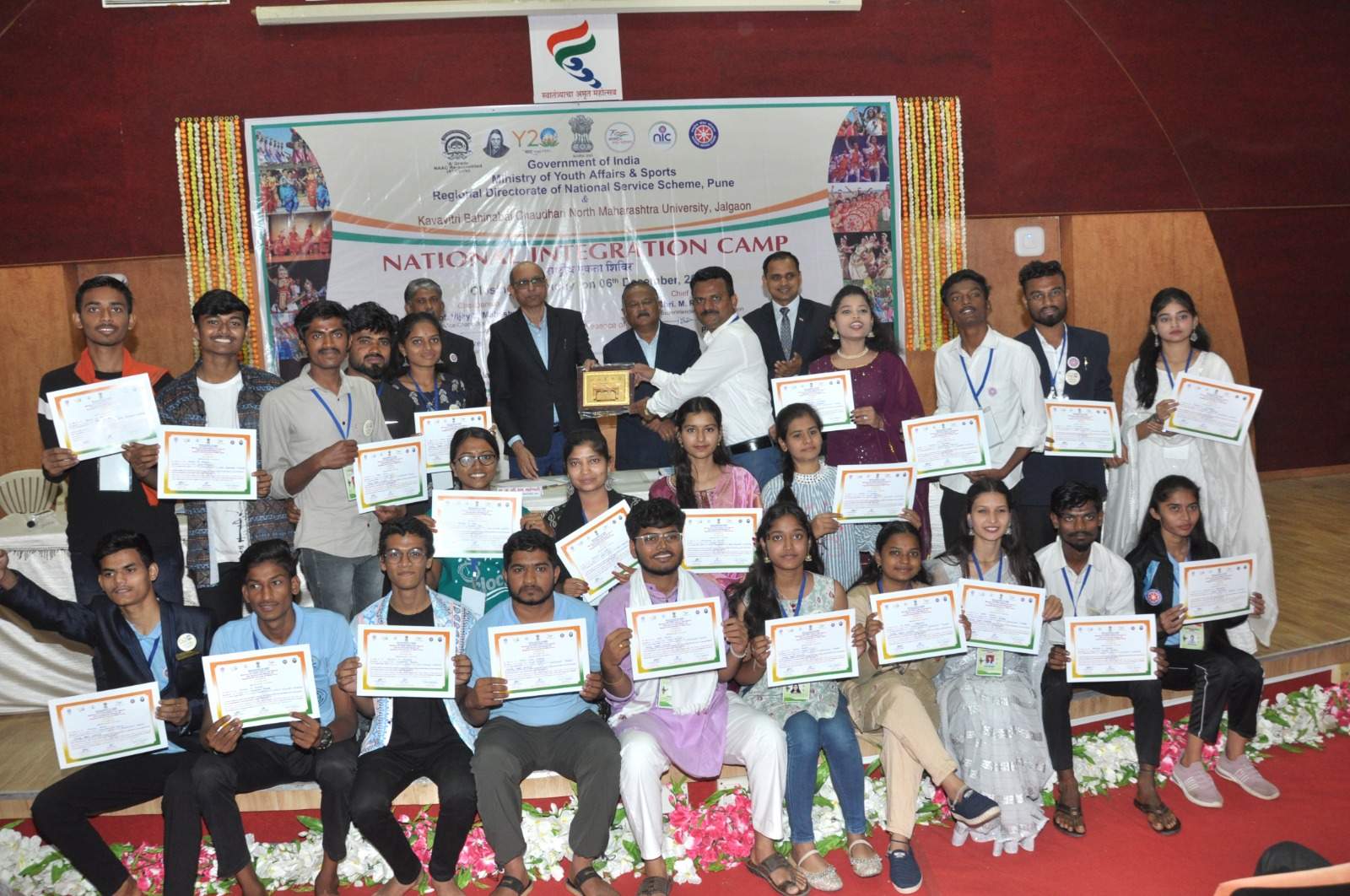 चंद्रपूर:-कवयित्री बहिणाबाई चौधरी उत्तर महाराष्ट्र विद्यापीठ जळगाव येथे. राष्ट्रीय एकता शिबिर आयोजित करण्यात आले. दिनांक 30 नोव्हेंबर ते 6 डिसेंबर पर्यंत या शिबिराचे उत्तम रित्या आयोजन करण्यात आले. राष्ट्रीय सेवा योजना भारत सरकार पुणे द्वारा आणि युवा खेल मंत्रालय पुणे यांच्या संयुक्त विद्यमाने आयोजित करण्यात आले होते. विविध राज्यातून स्वयंसेवक आपली वेशभुषा संस्कृती सादर केले. आणि गोंडवाना विद्यापीठ गडचिरोली येथील राष्ट्रीय सेवा योजनेचे विभागीय संचालक डॉ. श्याम खंडारे सर यांचे आणि सर्वांचे मनापासून धन्यवाद मानले. निखिल भडके, दर्शन मेश्राम, अखिलेश सहारे, राधिका दोरखंदे, सिध्दी उपाध्ये, सुरूची भांडारकर या सर्व स्वयंसेवकांनी आपली संस्कृती सादर केली. आणि उत्तम दर्जेदार सादरीकरण करण्यात आले.