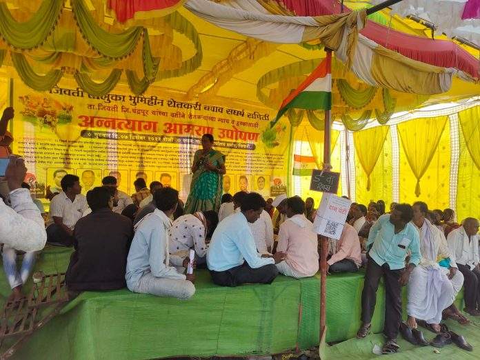 जिवती (ता.प्र.) : जिवती तालुक्यातील शेतकरी कष्टकरी यांचे नवरत्न ७ डिसेंबर पासून सतत तालुका भूमिहीन शेतकरी बचाव संघर्ष समितीतर्फे सुरू असलेल्या अन्नत्याग आमरण उपोषणाचा पाचव्या दिवश असून सुद्या प्रशासनाणी उपोषण कर्त्यांची दखल घेतली नाही.आणि भूमिहीन शेतकऱ्यांचा काहीही तोडगा निघाला नाही म्हणून पाचव्या दिवशी तालुक्यातील काना कोपऱ्यातील संतप्त शेतकरी बांधव हजारोच्या संख्येने रस्त्यावर उतरले.