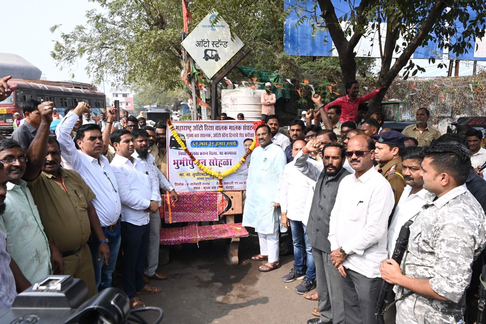 महाराष्ट्र ऑटोरिक्षा चालक मालक संघटनेच्या मुख्य बस स्थानक समोरील ऑटो स्टॅण्ड टिनाच्या शेडचे भूमिपूजन ना. श्री. मुनगंटीवार यांच्या हस्ते झाले. ना. श्री. मुनगंटीवार यांनी या कामासाठी ६९ लक्ष ३९ हजार रुपयांचा निधी उपलब्ध करून दिल्याबद्दल संघटनेने त्यांचे आभारही मानले. या कार्यक्रमाला भाजपा महानगराचे अध्यक्ष राहुल पावडे, महाराष्ट्र ऑटोरिक्षा चालक मालक संघटनेचे संस्थापक अध्यक्ष राजेंद्र खांडेकर, जिल्हाध्यक्ष मधुकर राऊत, जिल्हा सचिव सुनील धंदरे, संघटन प्रमुख विनोद चन्ने, भाजपाचे नेते रामपाल सिंग,अरुण तिखे, सुरेश तालेवार, दशरथ सिंग ठाकूर, बी बी सिंग, सचिन कोत्तपल्लीवार, चांद सैय्यद, सत्यम गाणार यांची प्रमुख उपस्थिती होती.