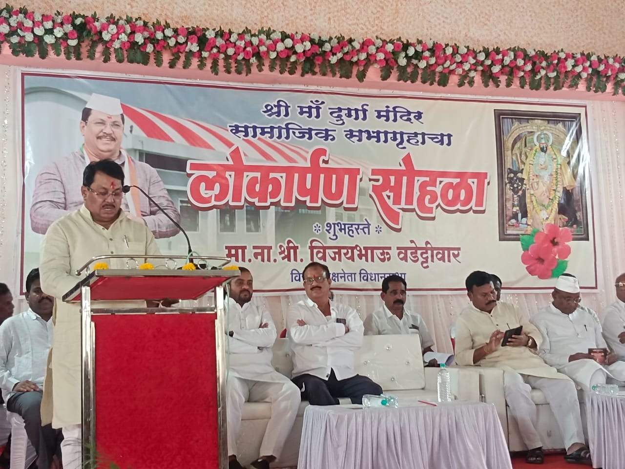 चंद्रपूर: जिल्हा खनिज विकास निधी व खासदार स्थानिक विकास निधी मधून बांधकाम करण्यात आलेल्या माॕ दुर्गा मंदिर सामाजिक सभागृह उभारून यातून होऊ घातलेली जनसेवा करण्याची संधी मला दुर्गामातेनेच दिली. व या सभागृहात विविध समाज उपयोगी कार्य पार पडेल अशी आशा व्यक्त करून सदर मंदिराचा संपूर्ण परिसर आगामी काळात देखणा करू असे प्रतिपादन विधान सभेचे विरोधी पक्ष नेते विजय वडेट्टीवार यांनी केले. ते मुल येथे दुर्गा माता मंदिर परिसरातील सभागृहा लोकार्पण सोहळा प्रसंगी उद्घाटन म्हणून बोलत होते.