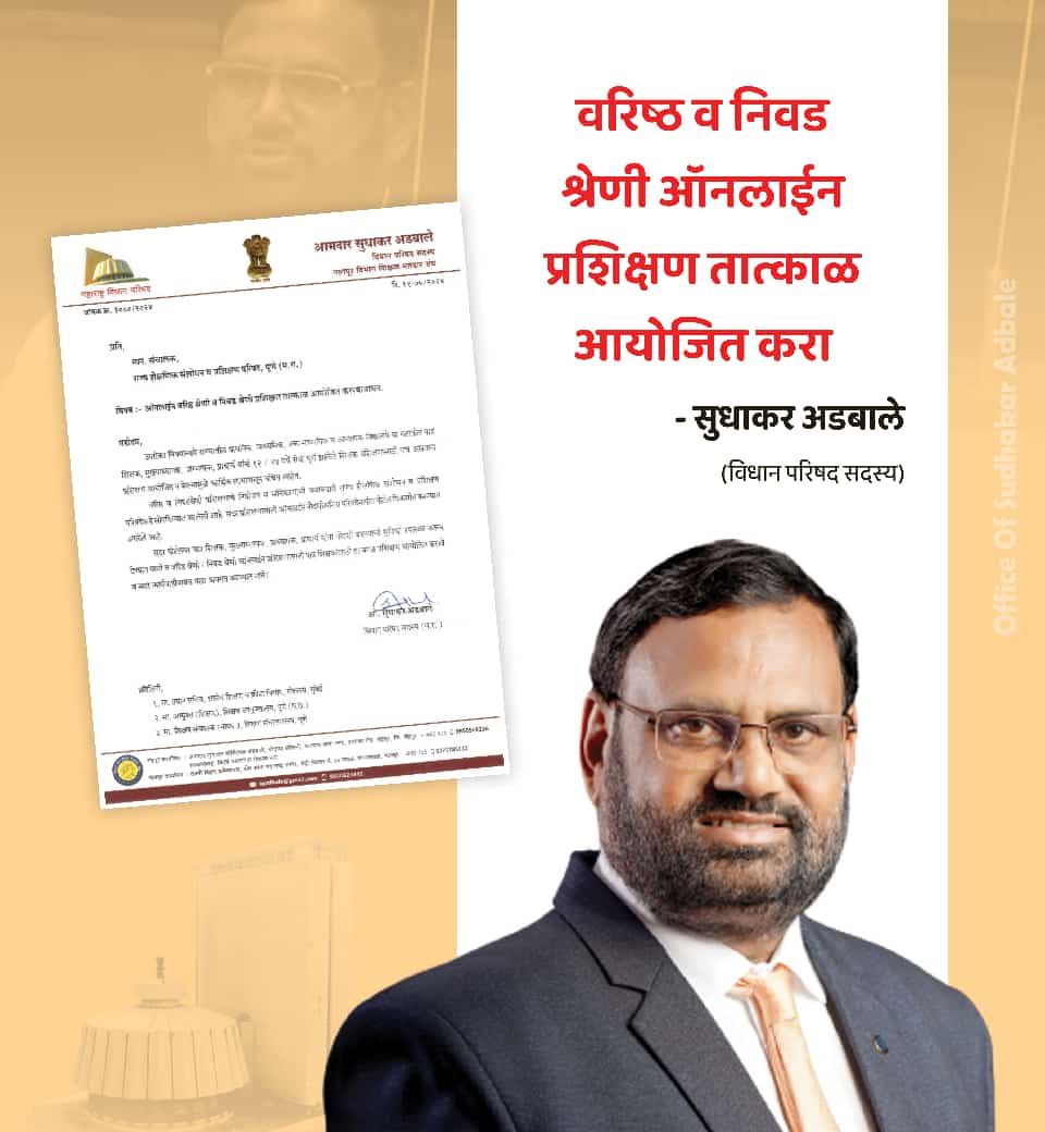 वरिष्ठ व निवडश्रेणी प्रशिक्षणाचे नियोजन व संनियंत्रणाची जबाबदारी राज्य शैक्षणिक संशोधन व प्रशिक्षण परिषदेकडे सोपविण्यात आलेली आहे. सदर प्रशिक्षणासाठी ऑनलाईन नोंदणीकरिता परिषदेमार्फत पोर्टल विकसीत करण्यात आलेले आहे. सदर पोर्टलवर पात्र शिक्षक, मुख्याध्यापक, प्राध्यापक, प्राचार्य यांना नोंदणी करण्याची सुविधा उपलब्ध करून देण्यात यावी व वरिष्ठ श्रेणी / निवड श्रेणी ऑनलाईन प्रशिक्षणासाठी पात्र शिक्षकांसाठी तात्काळ प्रशिक्षण आयोजित करावे, अशी मागणी आमदार सुधाकर अडबाले यांनी राज्य शैक्षणिक संशोधन व प्रशिक्षण परिषद, पूणे यांच्याकडे पत्राद्वारे केली आहे.