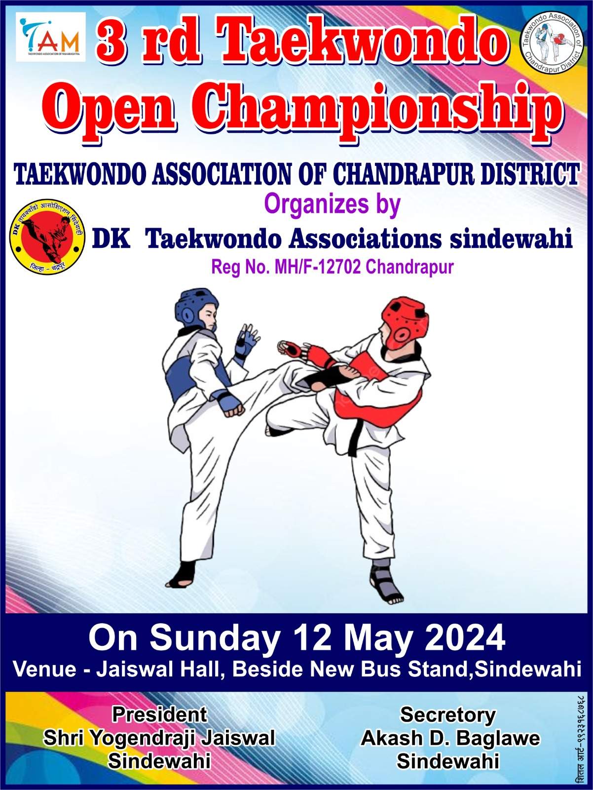 वरोरा:तिसरे ओपन जिल्हा स्तरीय तायक्वांडो स्पर्धेत २०२४, तायक्वांडो असोसिएशनच जिल्हा चंद्रपूर व्दारे आयोजित डि.के. तायक्वांडो असोसिएशन सिंदेवाही च्या वतीने चंद्रपूर जिल्हा स्तरीय तायक्वांडो स्पर्धेत २०२४ घेण्यात आले. या स्पर्धेत संपुर्ण जिल्ह्यातील स्पर्धकांनी सहभाग घेतला होता. यात प्रामुख्याने तायक्वांडो असोसिएशन वरोराच्या टिम ने सर्वाधिक यश मिळाले आहे त्यात खुशी किन्नाके (सुवर्ण पदक),विधी भोगेेकर (सुवर्ण पदक), कनक सावसाखडे (कास्यपदक), समंथा ताजणे (रजत पदक)विर निखाडे (कास्य पदक), कावेरी किन्नाके (रजत पदक),अर्निका मडावि (रजत पदक), संस्कार वारे (कास्य पदक), वरद झाडे(कास्य पदक), वस्तिक वारे (कास्य पदक), स्वरीत पाटील (रजत पदक), युगांत भांडकर (कास्य पदक) अशा ऐकून १२ खेळाडू नी यश मिळविले आहेत.