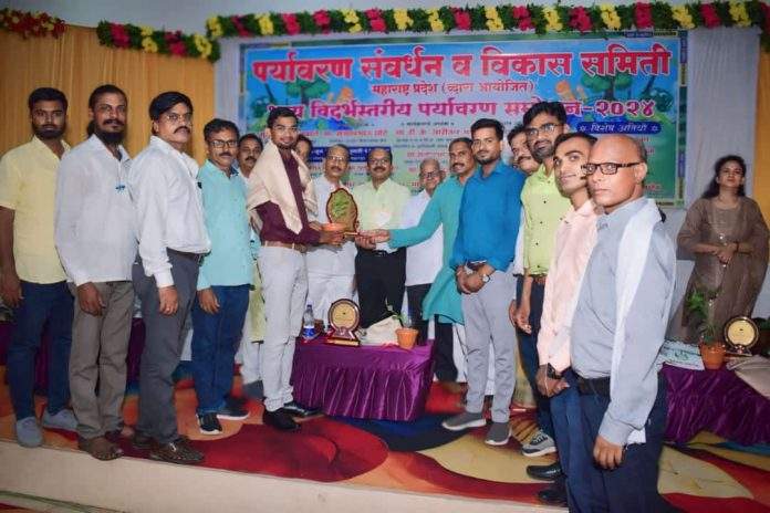 राजुरा: जागतिक पर्यावरण दिनानिमित्त पर्यावरण संवर्धन व विकास समिती महाराष्ट्र राज्य बलापूरच्या वतीने ९ जून रोजी एकदंत सभागृह येथे भव्य विदर्भस्तरित पर्यावरण संमेलनाचे आयोजन करण्यात आले. या संमेलनात उत्कृष्ट सामाजिक कार्य केल्याबद्दल विशाल शेंडे यांना शाल, रोपट आणि सन्मानचिन्ह देऊन समाजभूषण व पर्यावरण मित्र पुरस्काराने सन्मानित करण्यात आले. राजूरा तालुक्यातील जगद्गुरु तुकोबाराय सार्वजनिक वाचनालय वरूर रोड येथे मागील सात वर्षापासून वाचनालयाच्या माध्यमातून विविध सामाजिक, शैक्षणिक सांस्कृतिक उपक्रम राबविण्यात आले. महापुरुषांच्या जयंती पुण्यतिथी निमित्त प्रबोधनात्मक कार्यक्रम विद्यार्थ्यांसाठी विविध स्पर्धा उपक्रम स्वच्छता दिन जागृती वृक्षारोपण रक्तदान शिबिर तंबाखू व्यसनमुक्ती पर जनजागृती अंधश्रद्धा निर्मूलन एड्स जनजागृती रॅली, राखी रक्षाबंधन, लॉकडाऊन च्या काळात वेगवेगळे सामाजिक उपक्रम तसेच सोशल डिस्टन्स ठेवून विद्यार्थ्यांना शिक्षणदानाचे कार्य असे अनेक सामाजिक उपक्रम राबविल्या बद्दल विशाल शेंडे यांना समाजभूषण पुरस्काराने सन्मानित करण्यात आले.