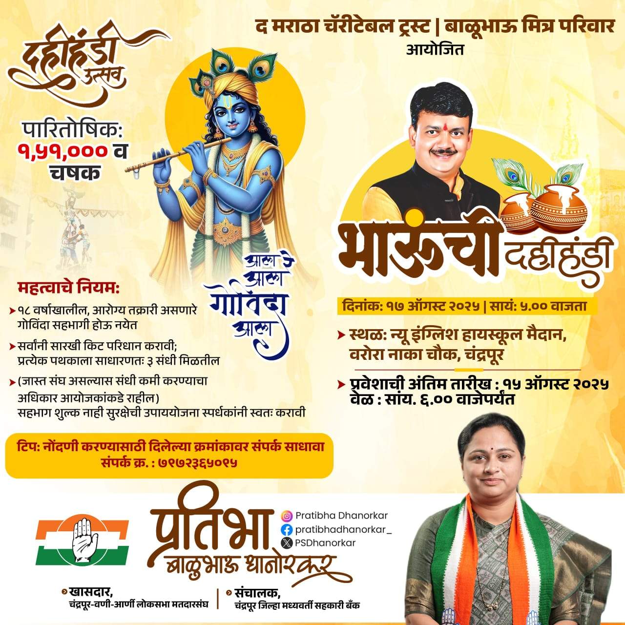या दोन्ही कार्यक्रमांविषयी अधिक माहितीसाठी आणि नावनोंदणीसाठी कृपया ७९७२३६९०४५ या क्रमांकावर संपर्क साधावा. चंद्रपूर जिल्ह्यातील सर्व नागरिकांना, विशेषतः गोविंदा पथक आणि लहान मुलांना या उत्साही क्षणात सहभागी होण्याचे आणि कार्यक्रमाला मोठ्या संख्येने उपस्थित राहण्याचे आवाहन करण्यात आले आहे.
