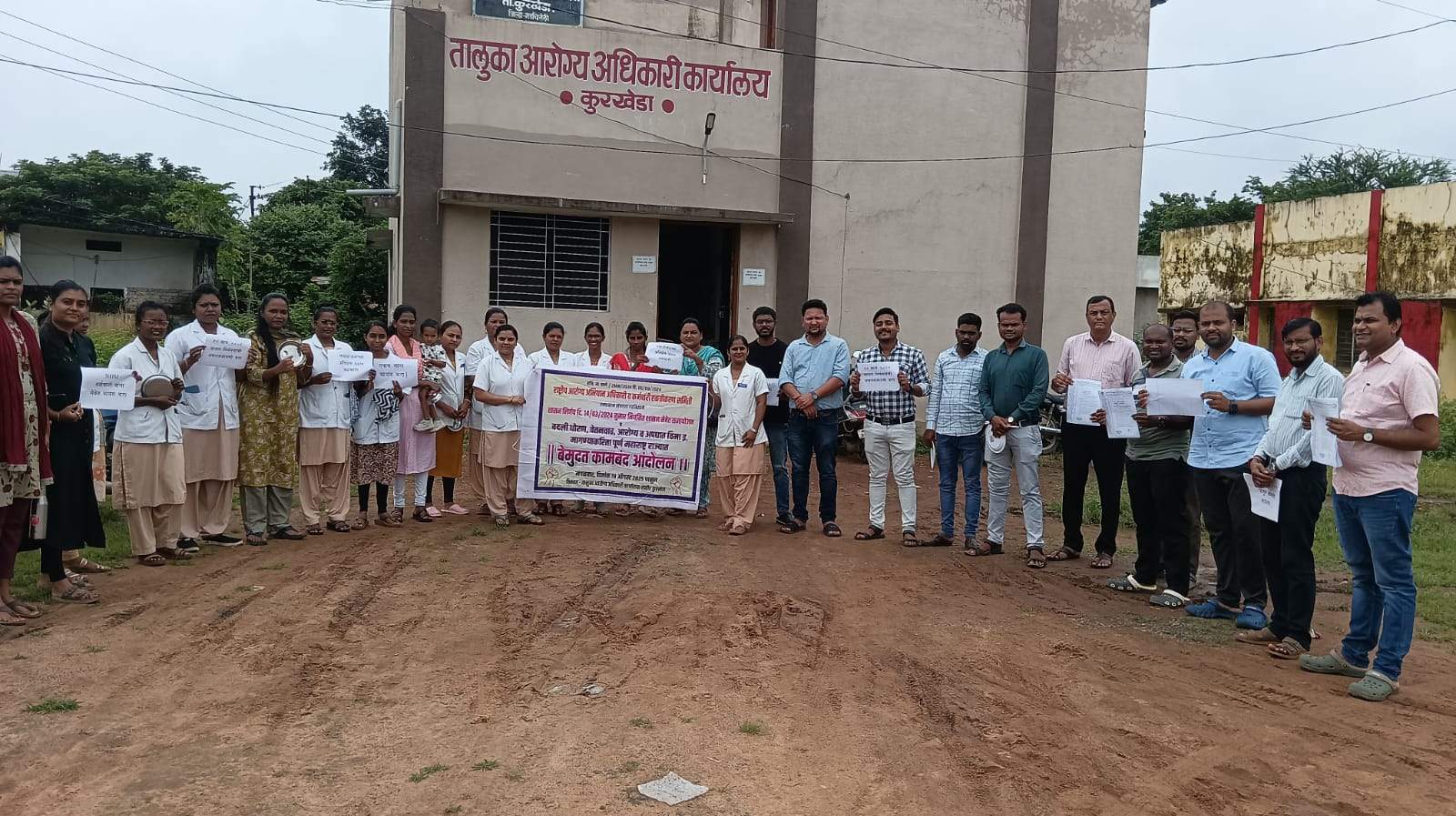 राष्ट्रीय आरोग्य अभियान अंतर्गत १० वर्षापेक्षा अधिक सेवा झालेल्या कर्मचार्याना दि.१४ मार्च २०२४ च्या शाशन निर्णयाप्रमाणे नियमित शाशन सेवेत समायोजन करण्याचा निर्णय घेण्यात आला आहे मात्र दिड वर्षाचा कालावधी होऊनही या निर्णयाची अद्याप अमलबजावणी करण्यात आलेली नाही सदर निर्णयाची तातडीने अमलबजावणी करण्यात यावी तसेच ३ वर्ष व ५ वर्ष सेवा पूर्ण झालेल्या अधिकारी कर्मचारी याना लायल्टी बोनस पूर्ववत लागू करण्यात यावा, ईपीएफ व ग्रॅज्युटी योजणा १५ हजार ५०० रू पेक्षा अधिक मानधन असणार्या सर्व कंत्राटी कर्मचार्याना लागू करण्यात यावी यासह कर्मचार्यांचा विविध न्याय मागण्याकडे लक्ष वेधण्याकरीता राज्या सह तालूक्यातील कंत्राटी आरोग्य कर्मचारी बेमूदत संप आंदोलन पूकारलेले आहे मात्र सर्व सामान्याचा आरोग्याशी निगडीत या महत्वपूर्ण प्रश्नाकडे असंवेदनशील शाशनाचे दूर्लक्ष होत असल्याने कर्मचार्यासह सर्व सामान्याचा मनात शाशन विरोधात चिड निर्माण होत आहे