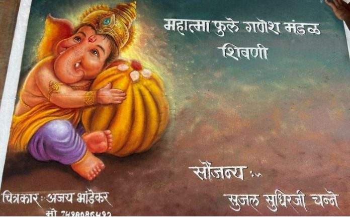 सिंदेवाही ( शिवणी) :- गणेशउत्सवा निमित्त महात्मा फुले गणेश मंडळ शिवणीच्या वतीने विविध कला गुणांना वाव मिळावा व वेगवेगळ्या प्रकारच्या चित्रकलेची, रंगकामाची गावातील, परिसरातील विद्यार्थाना ,कलाकारांना माहिती मिळावी यासाठी गणपती बाप्पाचे रांगोळीने अप्रतिम असे चित्र साकार करून गावातील सर्व भाविकांचे मन मंडळाने जिंकले.