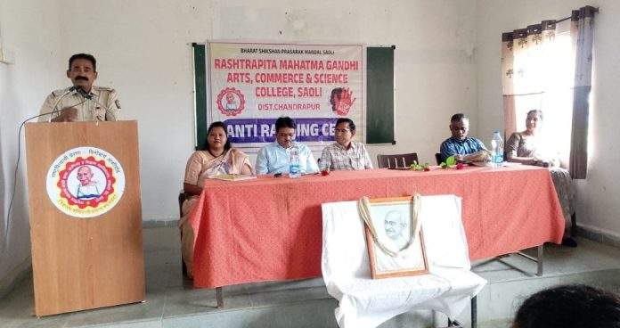 भारत शिक्षण मंडळ संचलित राष्ट्रपिता महात्मा गांधी कला, वाणिज्य व विज्ञान महाविद्यालय, सावली येथे अँटी-रॅगिंग जनजागृती कार्यशाळेचे आयोजन करण्यात आले. या कार्यशाळेचे उद्घाटन सावली येथील पोलीस निरीक्षक श्री. प्रदीप पुल्लुरवार तसेच बार असोसिएशनचे अध्यक्ष ॲड.धनंजय अंबटकर यांच्या हस्ते झाले.