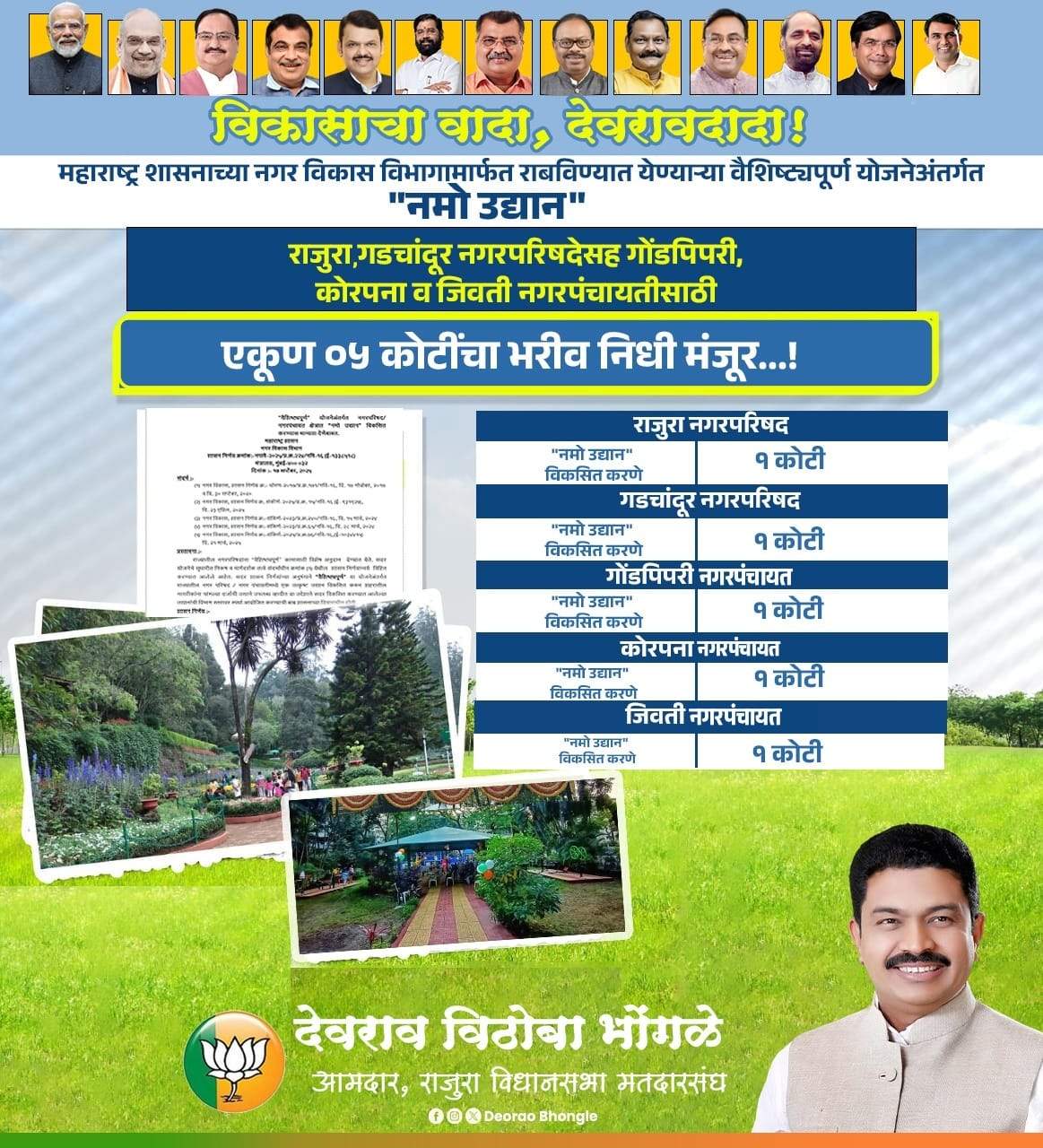 आमदार देवराव भोंगळे यांच्या सातत्यपूर्ण पाठपुराव्यामुळे या मागणीला यश आले असून, राजुरा विधानसभेतील प्रत्येक नगरपरिषद व नगरपंचायत क्षेत्रात या उद्यानासाठी शासनाकडून ०१ कोटी रुपयांचा निधी मंजूर करण्यात आला आहे.