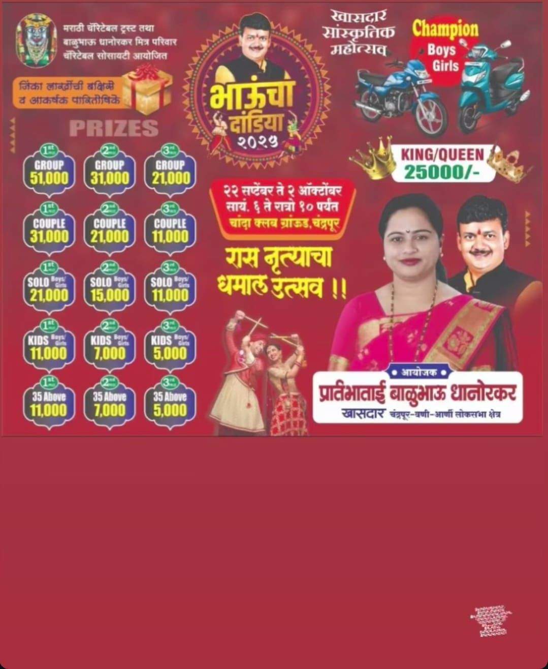 चंद्रपूरमध्ये सोमवार, २२ सप्टेंबरपासून खासदार सांस्कृतिक महोत्सवांतर्गत ‘भाऊचा दांडिया’चे भव्य आयोजन करण्यात आले आहे. खासदार प्रतिभा धानोरकर यांच्या विशेष उपस्थितीत हा अकरा दिवसांचा रंगारंग कार्यक्रम चांदा क्लब मैदानावर होणार आहे.