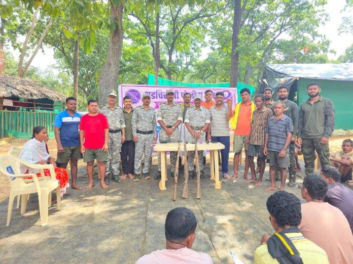 आज दिनांक- २०/०९/२०२५ रोजी मा. पोलीस अधिक्षक श्री. निलोत्पल सा., मा. अपर पोलीस अधिक्षक (अभियान) गडचिरोली श्री. एम. रमेश सा., मा. अपर पोलीस अधिक्ष्क्षक (प्रशासन) गडचिरोली श्री. गोकुळ राजजी सा., मा. अपर पोलीस अधिक्षक अहेरी श्री. सत्य साई कार्तिक सा., मा. उपविभागीय पोलीस अधिकारी भामरागड श्री. अगर मोहीते सा., मा. उपविभागीय पोलीस अधिकारी भामरागड, अतिरिक्त कार्यभार मा. श्री. अजय कोकाटे सा, यांचे मार्गदर्शनाखाली पोलीस मदत केंद्र पेनगुंडा येथील प्रभारी अधिकारी सपोनि. श्री. गणेश फुलकबर सा., पोलीस हवालदार सचिन भांडेकर, व्यंकटेश नासानी, पोलीस शिपाई आशिष भारतसागर, प्रेमदास बोरुले यांनी दिनांक-१७/०९/२०२५ रोजी पासुन मौजा परायनार येथील भरमार बंदुका बाळगत असलेल्या व्यक्तींना पो.म.के.ला बोलावून, त्यांना विश्वासात घेवुन, त्यांची मने जिंकुन पोलीस मदत केंद्रात जमा करणे बाबत मार्गदर्शन केले व सुचना दिल्या. दिनांक- १९/०९/२०२५ रोजी अपर पोलीस अधिक्षक अहेरी मा. श्री. सत्य साई कार्तिक सा. यांनी प्रत्यक्ष पो.म.के. ला भेट देवून भरमार बंदुका जमा करणे बाचत विशेष मार्गदर्शन केले. त्या अनुषंगाने प्रभारी अधिकारी सहायक पोलीस निरिक्षक श्री गणेश फुलकवर सा. यांचे अथक प्रयत्नाने तसेच जिल्हा पोलीसचे पोलीस उपनिरिक्षक श्री विशाल गडकर सा. एसआरपीएफ गट क्रमांक ०६ धुळे चे पोलीस उपनिरिक्षक श्री कांबळे सा. यांच्या मदतीने मौजा परायनार गावातील नागरीकांनी ०३ नग भरमार बंदुका पोलीस मदत केंद्र पेनगुंडा येथे जमा करण्याकरिता आल्याने त्यांचे स्वागत करुन भरमार बंदुका जमा करण्यात आले त्यावेळी सिआरपीएफचे असीटंट कमांडंट अशोक रिअल सा. व मौजा परायनार गावातील ३० ते ४० नागरीक उपस्थित होते.