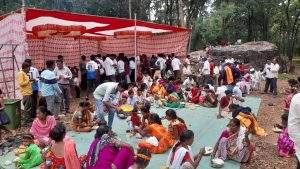 दरवर्षीप्रमाणे यावर्षी सुद्धा भव्य महाप्रसाद वितरण कार्यक्रम संपन्न झाला! येथे आदिवासी समाजाचे राजाराणी देवस्थान आहे व या ठिकाणी खालच्या भागात खुणे कंट्रक्शन कंपनी व एल, एल डोंगरवार कन्ट्रक्शन कंपनीचे प्रमुख राष्ट्रीय मानवाधिकार संघटनेचे प्रदेश अध्यक्ष डॉ, प्रणय भाऊ खुणे यांचे परिवार गुरनोली यांचे आराध्य दैवत “आदिशक्ती दुर्गामाता मंदिर “आहे या मंदिरात गेल्या अनेक वर्षापासून दरवर्षी नवरात्रीला संपूर्ण मुतणुर व परिसरातील हजारो नागरिकांकरिता भव्य महाप्रसाद वितरणाचा कार्यक्रम असतो यावर्षी सुद्धा सदर महाप्रसाद वितरण संपन्न झाले.गडचिरोली जिल्ह्यातील भाविक भक्त यांनी महाप्रसाद वितरणाच्या कार्यक्रमास उपस्थित राहुन मोठया संख्येने महाप्रसाद ग्रहण केले व स्वइच्छेने येथे आयोजित रक्तदान शिबिरात रक्तदान केले व आरोग्य शिबिराचा सुद्धा लाभ घेतला खुणे कंट्रक्शन कंपनीचे प्रमुख डॉ, प्रणय भाऊ खुणे यांच्यावतीने स्व खर्चाने येथे 50 लाख रुपये खर्च करून जयपुर व राजस्थान येथील कलाकारांच्या हस्ते बांधकाम होत असलेल्या दुर्गा मंदिराचे पाहनी केले यावेळी डॉ, प्रणय खुणे यांनी येथील सर्वांगीण विकासासाठी राज्य सरकारकडे आवश्यक निधीची मागणी केली कार्यक्रमात प्रामुख्याने राष्ट्रीय मानवाधिकार संघटनेचे प्रदेश उपाध्यक्ष भारत खटी, सल्लागार देवा भाऊ खुणे, कन्स्ट्रक्शन कंपनी संचालक व लोकेश भाऊ डोंगरवार ,राकेश भाऊ डोंगरवार व राहुल भाऊ झोडे, नितेशभाऊ खुणे व संपूर्ण खुणे परिवार गुरनोली ता, कुरखेडा जिल्हा गडचिरोली येथील संपूर्ण खुणे परिवार व या भागातील इलाका प्रमुख, गाव पाटील, भूमीया, ग्रामसभा अध्यक्ष,सरपंच, उपसरपंच पोलीस पाटील ,राष्ट्रीय मानवाधिकार संघटनेचे प्रमुख पदाधिकारी महिला आघाडी जिल्हाध्यक्षा मनीषाताई मडावी, सामाजिक कार्यकर्ते जगदीश मडावी, प्रमोद आसुटकर युवा मोर्चा नेते सुमेन विस्वास, सुकंठ रॉय, कार्यकर्ते मोठ्या संख्येने उपस्थित होते.
