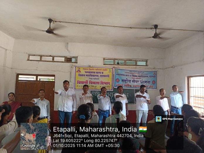 एटापल्ली: भगवंतराव कला व विज्ञान महाविद्यालय एटापल्ली, जिल्हा गडचिरोली येथे 1 ऑक्टोबर “राष्ट्रीय रक्तदान दिना”निमित्त पोलीस स्टेशन एटापल्ली आणि भगवंतराव महाविद्यालय एटापल्ली येथील राष्ट्रीय सेवा योजना आणि विद्यार्थी विकास विभाग यांच्या संयुक्त विद्यमाने राष्ट्रीय रक्तदान दिन साजरा करण्यात आला. यावेळी या कार्यक्रमात प्रमुख पाहुणे म्हणून डॉ.बि.डी. कोंगरे, डॉ.व्हि.ए. दरेकार, श्री. ज्ञानेश्वर कोल्हे (पोलीस उपनिरीक्षक, पोलीस स्टेशन, एटापल्ली), डॉ. निलेश दुर्गे (विद्यार्थी विकास अधिकारी), श्री. राघवेंद्र सुल्वावार( माजी बांधकाम सभापती, नगरपंचायत एटापल्ली) श्री. राहुल कुडमेथे (नगरसेवक, नगरपंचायत एटापल्ली), प्रा. भारत सोनकांबळे, डॉ. श्रुती गुब्बावार (रासेयो सहाय्यक कार्यक्रम अधिकारी), प्रा. चिन्ना पुंगाटी (रासेयो सहाय्यक कार्यक्रम अधिकारी), प्रा.राहुल ढबाले, प्रा. अतुल बारसागडे, श्री. प्रभाकर नाईक ( पोलिस हवालदार) इत्यादी उपस्थित होते.