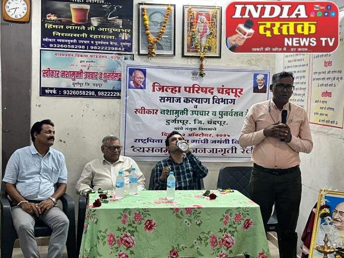 सामाजीक न्याय विभागा अंतर्गत समाज कल्याण विभाग जि.प. चंद्रपूर व स्वीकार नशामुक्ती उपचार व पुनर्वयण केंद्र दुर्गापूर च्या संयुक्त विद्यमाने महात्मा गांधी जयंती निमित्त चंद्रपूर जिल्ह्यात विविध ठिकाणी व्यसनमुक्तीवर कार्यक्रम घेण्यातआले.