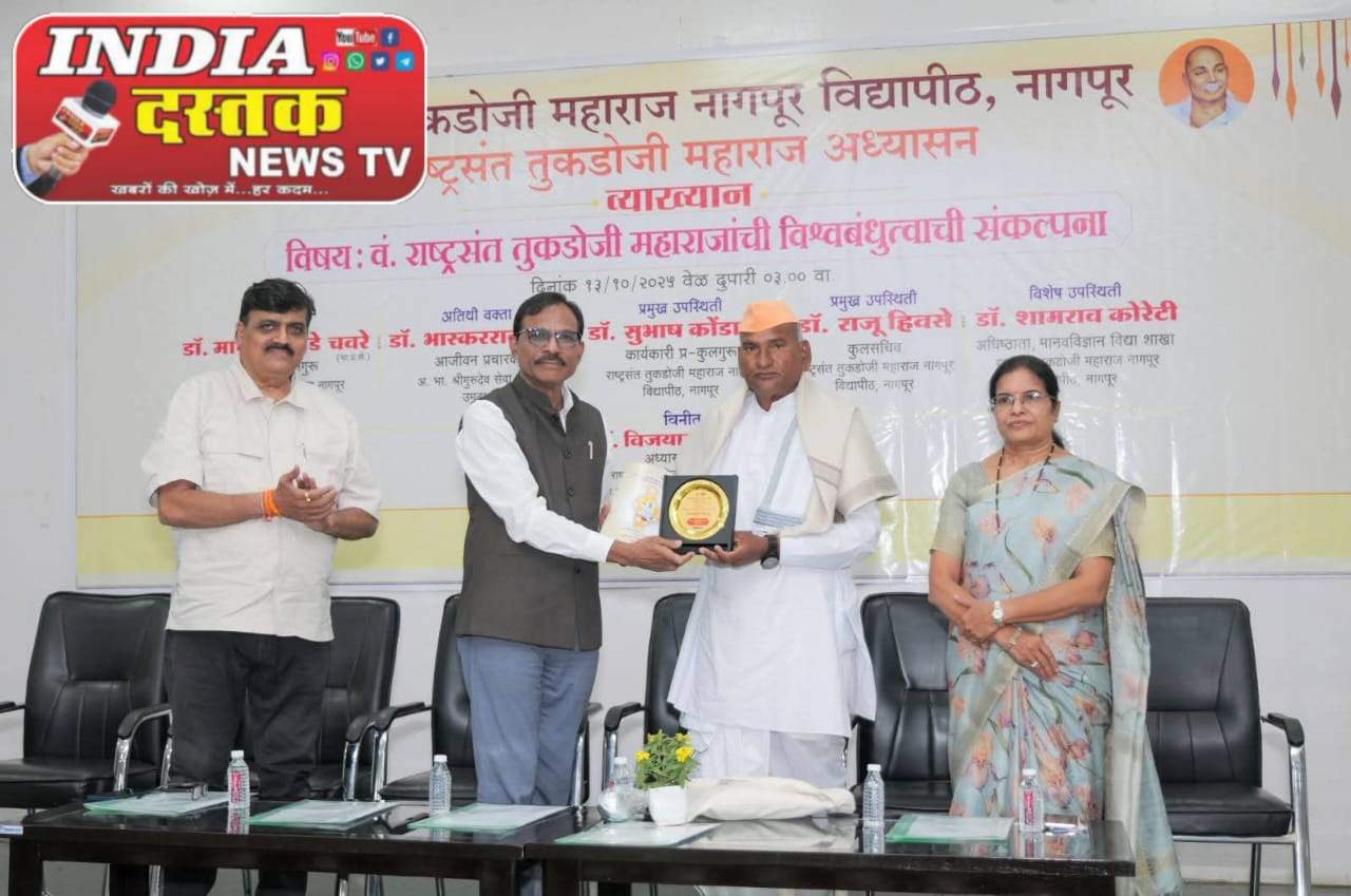 राष्ट्रसंत तुकडोजी महाराज मानव धर्माचे महान प्रचारक होते, असे प्रतिपादन अखिल भारतीय श्री गुरुदेव सेवा मंडळाचे आजीवन प्रचारक डॉ. भास्करराव विघे यांनी केले. राष्ट्रसंत तुकडोजी महाराज नागपूर विद्यापीठाच्या जमनालाल बजाज प्रशासकीय भवनातील सभागृहात राष्ट्रसंत तुकडोजी महाराजांच्या ५७ व्या पुण्यतिथीनिमित्त सोमवार, दि.१३ ऑक्टोंबर २०२५ रोजी विशेष व्याख्यान पार पडले. राष्ट्रसंत तुकडोजी महाराज अध्यासनाच्या वतीने आयोजित व्याख्यानात डॉ. भास्करराव विघे मार्गदर्शन करीत होते.